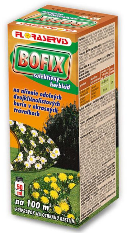 Bofix je selektívny, systémovo pôsobiaci listový herbicíd na ničenie odolných dvojklíčnolistových burín v trávach na semeno, v novozaložených a starších okrasných trávnikoch a trávnatých športoviskách a ihriskách. Používajte prípravok na ochranu rastlín bezpečným spôsobom. Bofix preniká do burín cez listy a účinné látky sú rýchlo translokované. Účinok prípravku na buriny sa prejaví už za niekoľko hodín. Citlivé buriny Bofix ničí spoľahlivo vo fáze 2-4 listov. Pri ničení pupenca roľného sú dosahované najlepšie výsledky pri aplikácií herbicídu Bofix v období kvitnutia pupenca, kedy transpiračný tok smeruje do koreňa buriny.