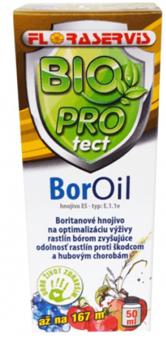 Boritanové hnojivo na optimalizáciu výživy rastlín bórom zvyšujúce odolnosť rastlín proti škodcom a hubovým chorobám. Jednozložkové boritanové listové hnojivo BorOil v ošetrených rastlinách optimalizuje výživu rastlín bórom a tým zvyšuje množstvo a kvalitu výnosu plodín. Vodorozpustný bór vo forme bóretanolamínu v hnojive je veľmi rýchlo absorbovaný pletivami rastlín. Prírodné mastné kyseliny a terpény v hnojive zabránia napadnutiu rastliny cicavými a žravými škodcami ako aj múčnatkou.