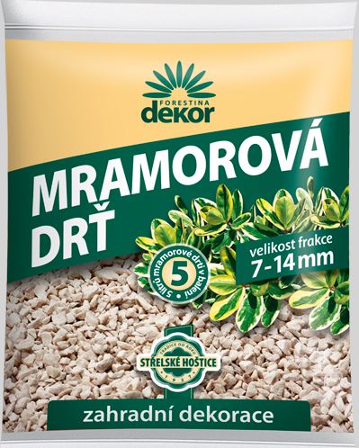 Mramorová drť je prírodný materiál bielej farby, vyrobený drvením mramoru. Používa sa k dekoračným účelom, rovnako v interiéry ako aj v exteriéry (cestičky, úprava hrobov, mulčovanie a pod.)Objem: 5 L