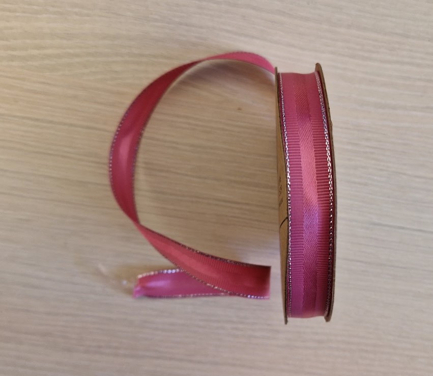 Stuha saténRyps+strieborný okraj 1,5cm/9m tm.ružovSkladom 2 bal4,50 €/ bal3,66 € bez DPH